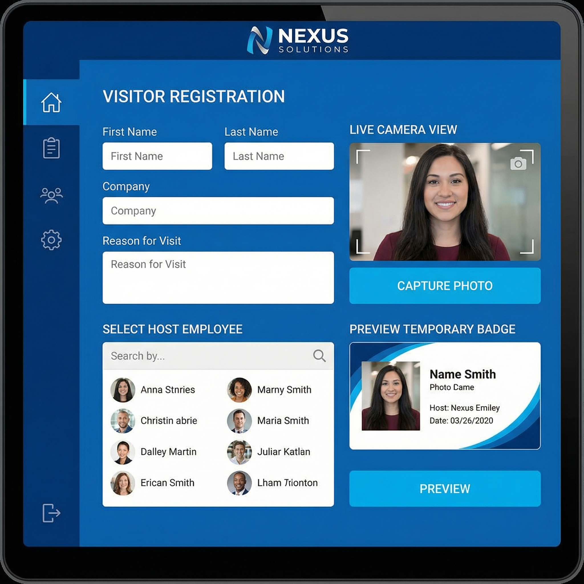 Ofrecemos software profesional de gestión de visitas con tablet touchscreen en recepción. El sistema permite registro de datos del visitante (nombre, DNI, empresa, motivo), captura de fotografía, selección del empleado a visitar con notificación automática vía email/SMS, impresión de credencial temporal con foto y código QR, registro de horario de entrada/salida con trazabilidad completa, y reportes exportables para auditorías o análisis. La plataforma es cloud, accesible desde cualquier dispositivo para consultas de administración.